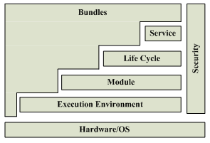 OSGi \[1]\[2]\[3]\[4] 標準是1999年由Open Service Gateway Initiative協會制定的標準，在OSGi架構圖中，Execution Environment為JVM虛擬平台，OSGi規格是依據Java平台所制定的，而Bundle由一個Java的JAR 檔案所組成，JAR主要是由Java class檔所構成，Bundle與Bundle之間可以透過Import使用其他Bundle的Export資源，而透過Export可釋出資源與其他Bundle分享。因此，只要是基於Bundle所設計的服務就能夠達到服務的資源分享。Security是基於Java2 security所制定，Module在Bundle與Bundle間使用彼此制定的Java Packages規則。而Life cycle定義了Bundle的生命週期，包括已安裝、等待啟動、啟動、執行、停止、取消安裝。Service是定義動態的合作模式，Bundle可以將本身的Service註冊於Service Registry，因此，其他的Bundle就能夠經由Service Registry獲知所需要的服務。\\