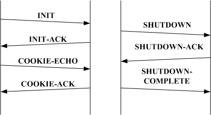 IETF組織於2000年十月制定了SCTP（Stream Control Transmission Protocol）通訊協定，SCTP透過四向交握（four-way handshake）的方式（圖1）建立一個初始連線（association），並經由Cookie機制作為端點之間的認證，如此的設計可避免傳統TCP三向交握（圖2）過程中易遭受服務阻斷攻擊之弱點。在連線中斷方面，TCP採用四向交握方式結束連線（圖2），當TCP連線之一方已經關閉了並且無法繼續傳送新的資料，而另一方仍保持開啟狀態並可以繼續傳送資料，即所謂之半關閉狀態（half-closed state）；而SCTP是以三向交握的方式結束連線（圖1），不提供半關閉狀態，接收端在接收由傳送端送出SHUTDOWN訊息的chunk之後，會回傳一個SHOUTDOWN-ACK封包進行回覆，等待結束連線的傳送端確認完成後便結束連線，同時傳送SHUTDOWN-COMPLETE的訊息至接收端。在一個SCTP封包中能夠包含不同的資料區塊（data chunk）與控制區塊（control chunk），而SCTP通訊協定以heartbeat封包對路徑進行偵測與回復。