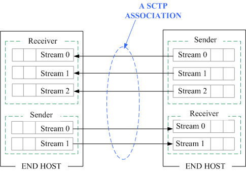 SCTP 通訊協定之多重串流特性有別於傳統的 TCP 通訊協定單一串流（single-stream），當端點建立連線時，可預先相互協調將要使用的串流數量，並且能夠將不同類型的資料分別以不同的串流傳輸，當其中一個串流正在等待重新傳送的訊息時，其他串流仍然能夠繼續傳送，在每個串流中的 data chunk 都會有各自運作的的串流序號（SSN, stream sequence number），因此在某一個串流的封包重送動作並不會使其他串流因等待重送的封包而造成延遲。如應用於網頁伺服器時，不需為了同時傳輸多個檔案而建立多個連線，網頁與圖片能夠透過不同的串流傳輸，不需等待網頁傳輸完畢，圖片就能透過其他串流同時傳輸。多重串流之功能可以改善原本因單一串流時，必須等待遺失封包之重送而產生的 HoL Blocking 延遲，圖3是一個 SCTP 多重串流的示意圖，SCTP 兩端點透過一條 SCTP 連線（association）進行通訊，在接收與傳送的部份，可使用多個串流進行資料的傳送與接收。