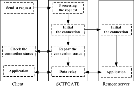SCTPGATE整體的運作方法如圖2所示，客戶端（client）在與遠端主機連線之前，需先行發送連線請求給SCTPGATE，在請求中會告知SCTPGATE遠端主機之IP位址與連接埠號（port number），而SCTPGATE在接收到此請求之後，會根據請求中所指定的IP與連接埠進行連線的建立，當完成連線建立時，SCTPGATE再回報客戶端端通知連線已經建立成功，而SCTPGATE則開始負責兩端點資料的轉送工作。SCTPGATE之方法為接收以TCP（SCTP）通訊協定傳輸之資料，再將資料轉以SCTP（TCP）通訊協定傳送，轉換方式運作為於傳輸層之上將資料接收並重新封裝後進行傳輸，而非將傳輸層之TCP通訊協定與SCTP通訊協定互相轉換。