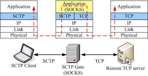 Huang \[1] 提出SCTPGATE之SCTP Proxy方法，SCTPGATE可達到代理TCP與SCTP通訊協定資料交換之目的，作者將SCTP通訊協定加入SOCKS v4 \[2] 應用程式中，使SOCKS應用程式可同時支援TCP與SCTP通訊協定，因此能夠處理TCP與SCTP通訊協定間的傳輸資料，可負責代理轉送的工作。SOCKS協定於OSI 模型中位於傳輸層與應用層間，不僅能作為proxy伺服器，亦能夠設定條件作為防火牆過濾之功能。作者所提出之SCTPGATE運作模式如圖1所示，SCTP client之網路應用程式所傳輸的資料在經過SCTPGATE時，SOCKS會接收SCTP client傳送的資料，並以TCP協定進行代理轉送資料予remote TCP server，以此代理方式達成TCP與SCTP通訊協定之互通。