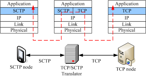 Chang等學者 \[3] 在2005年提出了TCP/SCTP通訊協定轉換機制的proxy網路架構與概念，於TCP與SCTP協定間進行轉換，讓TCP端點設備可透過SCTP proxy轉換伺服器而能夠與使用SCTP之端點通訊。在圖3表示TCP/SCTP translator之轉換能夠在傳輸層對於TCP與SCTP通訊協定直接進行轉換，因此可以讓單獨運作TCP與SCTP通訊協定之端點設備可透過TCP/SCTP translator之代理轉換而互相通訊。