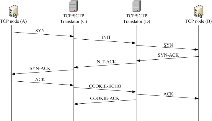 在TCP/SCTP訊息轉換的處理方面，圖6為初始連線的轉換流程，當TCP node (A) 與TCP node (B) 建立TCP連線時，需要進行三向交握的連線過程，由圖6可知，當TCP node (A) 送出的TCP之SYN訊息在經過TCP/SCTP translator (C) 時，TCP的SYN訊息會轉換為SCTP之INIT訊息，並且在傳送到TCP/SCTP translator (D) 時，再將SCTP INIT訊息轉換為原本TCP SYN訊息並傳送至TCP node (B)，將TCP通訊協定初始連線所使用的封包與SCTP通訊協定初始連線之封包互相對應轉換，而完成連線建立之目的。