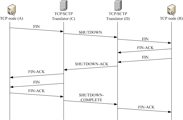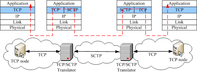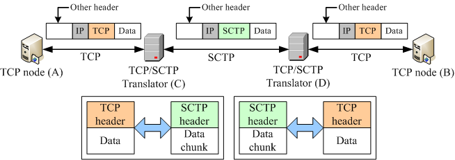 圖5為TCP/SCTP轉換之示意圖，TCP node (A) 傳送之TCP訊息在經過TCP/SCTP translator (C)時，整個TCP訊息會被拆解並且對應為SCTP訊息，再以SCTP通訊協定將資料傳輸至TCP/SCTP translator (D)，而當TCP/SCTP translator (D) 接收到SCTP訊息時，會將SCTP訊息拆解恢復為對應之TCP訊息後，再轉送給TCP node (B)。這樣的轉換方式不需更動兩端點之網路設備與設定就能夠達到以SCTP通訊協定代替TCP通訊協定傳輸資料之目的。